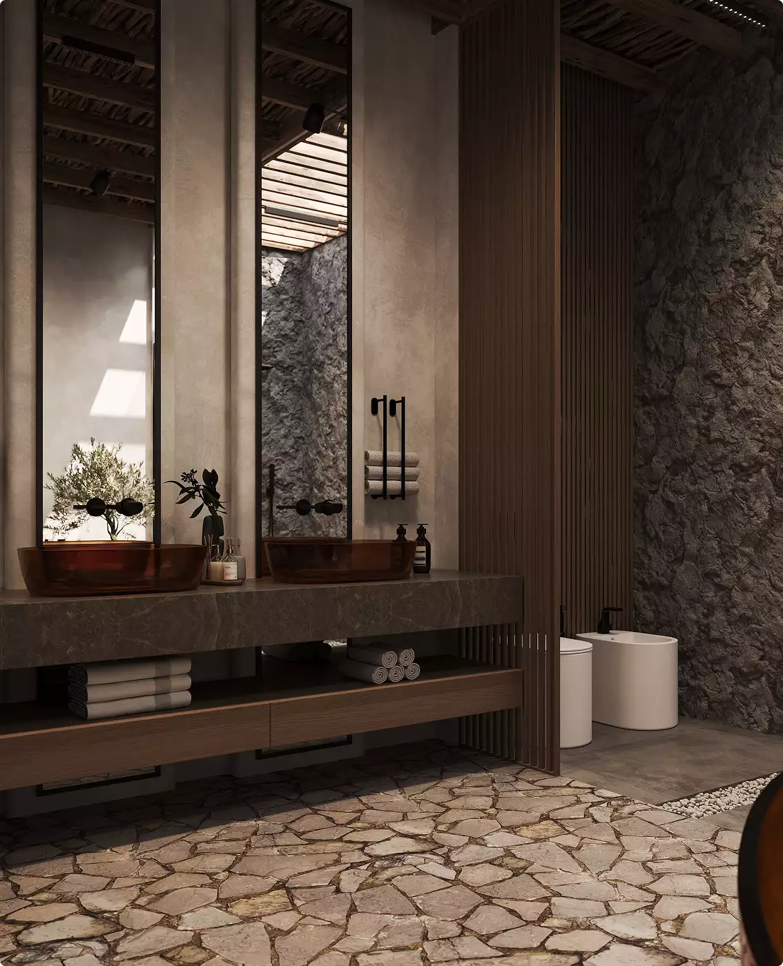 The bathroom view focused on crafted simplicity: natural stone, warm timber, and filtered greenery created a ritualistic sense of arrival. Rather than emphasizing scale, the composition positioned daily use as a refined experience, reinforcing the home’s quiet authority.